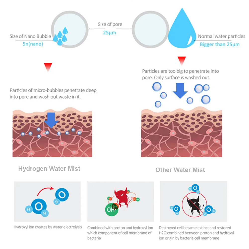 - Vooruitgang in microdeeltjes: Nanogrote waterstofbelletjes in de mist reinigen en hydrateren de huid diepgaand doordat ze de poriën effectiever binnendringen dan gewone waterdeeltjes.
